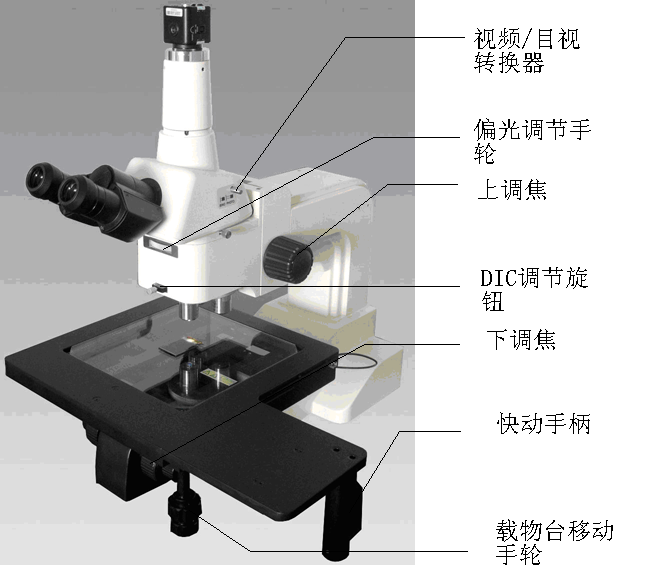 4. DIC調(diào)節(jié)旋鈕:在微分干涉觀察中使用,觀察導(dǎo)電粒子壓痕等。旋轉(zhuǎn)旋鈕可以調(diào)節(jié)觀察效果.